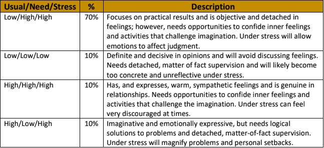 In reviewing any of the Birkman Components, there are four possible patterns that might be generated. We have listed the combinations here for Empathy with the approximate percentage of the population that will show each pattern, as well as some narrative descriptions for how to understand these patterns.